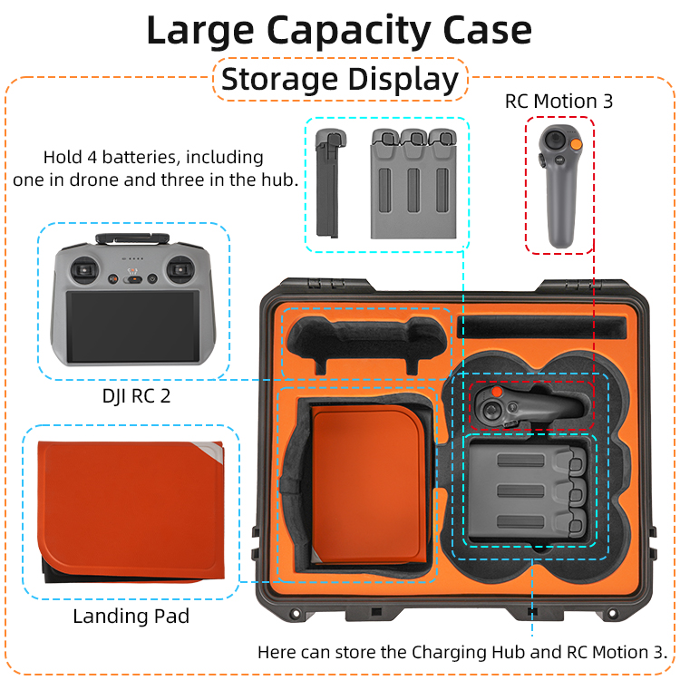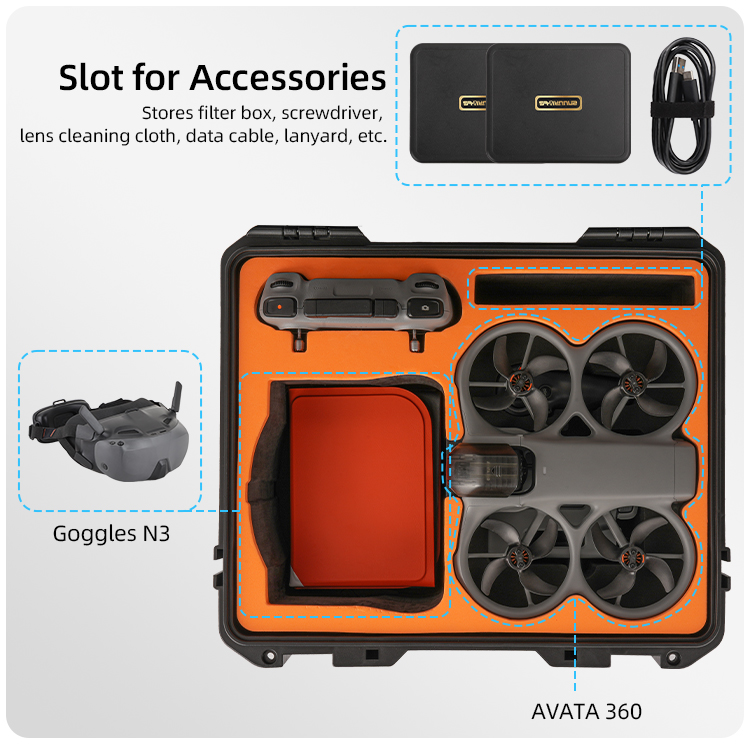 - Large Capacity Case: it can hold Avata 360, RC 2 Controller, Goggles N3, RC Motion 3, Battery Charging Hub, 4 batteries(including one in drone and three in the hub.), and accessories like screwdriver, lens cleaning cloth, cables, screwdriver, lanyard, and other tools.